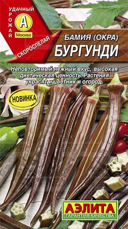 Набирающая популярность однолетняя овощная культура. Растет быстро, начинает плодоносить уже на 55-65 день после всходов и продолжает отдавать урожай до первых заморозков. Растения мощные, экзотического вида, в средней полосе вырастают до 120-150 см, в южных регионах – до 200 см. В пищу употребляют молодые 3-6 дневные завязи (коробочки) массой по 10-30 г. Вкус у плодов необычный, чем-то напоминает баклажан и спаржу, но более нежный и пикантный. Их используют в свежем виде в салатах, для приготовления супов и гарниров. Плоды бамии низкокалорийные и очень рекомендуются в диетическом питании.В средней полосе рекомендуется выращивать под пленкой, в южных регионах – в открытом грунте. Растение нуждается в пасынковании. Завязи срезают или выламывают регулярно, каждые 3-4 дня. При запаздывании со сбором коробочки грубеют и становятся несъедобными