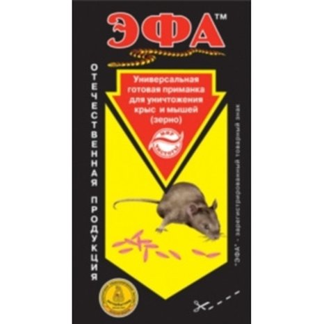 Средство родентицидное ЭФА представляет собой готовую к применению приманку. Эффективность средства для крыс и мышей 80%-90%. Сроки гибели - от 4 до 11 суток.