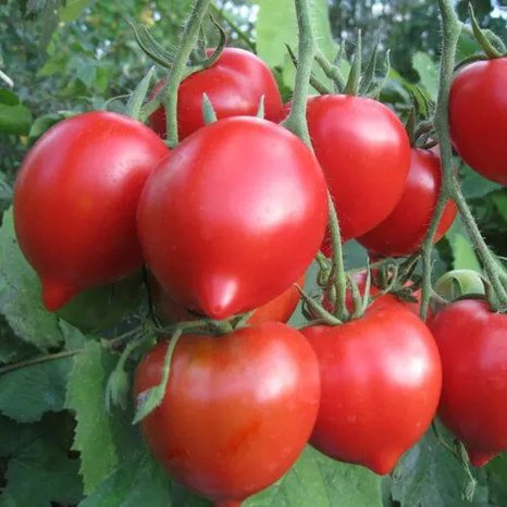Плоды округлые с «носиком» на вершине, гладкие, очень плотные, многокамерные, равномерно красные.
