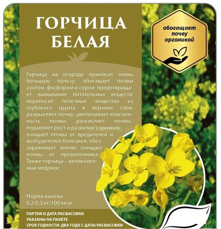 Однолетнее масличное растение из семейства крестоцветных, имеющее глубокую корневую систему и большую зеленую массу. Горчица является хладостойким растением и имеет короткий вегетационный период. Прекрасный сидерат для обогащения почвы органикой. Используется для -обогащения почвы азотом, фосфором и серой; -предотвращения вымывания питательных веществ; -разрыхления почвы, увеличения влагоемкости; -раскислеия почвы, подавления роста и развития сорняков; -очищения почвы от вредителей и возбудителей болезней; -обеззараживания земли; -очищения почвы от проволочника; -отличный медонос. Посев горчицы производят сплошь или рядками на глубину 2-3 см. Сажают горчицу осенью, после уборки урожая, или весной, за 1 месяц до начала цветения, когда растение достигнет высоты на 15-20 см.