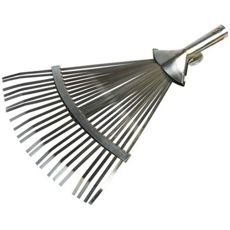 Плоские зубцы изготовлены из высококачественной углеродистой стали и оцинкованы. Механизм фиксации зубцов позволяет регулировать ширину рабочей части от 32 до 42см. Применяются для уборки опавших листьев и скошенной травы на садовых и огородный участках.
