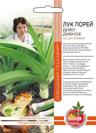 дин из лучших сортов порея – Диво дивное. Многолетник, из семян его можно вырастить за 5–7 месяцев. Стебель имеет цилиндрическую форму, достигает в среднем до 20 см в высоту и до 5–7 – в диаметре. На верхней части стебля веерообразно размещаются широкие, тёмно-зелёного цвета, с восковым налётом на поверхности листья, которые плотно прилегают друг к другу. Розетка довольно раскидистая, луковица белая, небольшого размера.