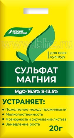 Эффективное магниевое серосодержащее удобрение. Повышает урожайность, улучшает вкусовые качества картофеля, овощей за счёт увеличения содержания в плодах крахмала и витаминов. Чем легче и кислее почва, тем острее может быть дефицит магния. Из огородных культур на недостаток магния наиболее остро реагируют томаты, огурцы, картофель.