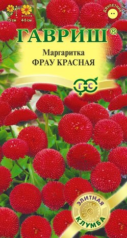 Маргаритки группы сортов «Фрау» обладательницы крупных, плотных как помпоны махровых соцветий, диаметром 4-5 см. Кусты прочные пышные, одинакового размера, высотой 15 см, в пору цветения, обильно усыпаны красно-малиновыми соцветиями. Серия успешно используется в профессиональном и любительском садоводстве для выращивания на клумбах, рабатках, в бордюрах, а также в горшках и балконных ящиках. Маргаритка неприхотливое многолетнее растение, культивируемое как двулетнее. Предпочитает солнечные места без застоя воды. Хорошо переносит легкое затенение. Недостаток влаги в период цветения может привести к измельчению и полному исчезновению соцветий. Семена высевают в открытый грунт в конце июня — начале июля, всходы появляются через 7-10 дней. Цветение начинается в апреле на второй год после посева. При хорошем уходе растение цветет до осени, с перерывом в жаркий период сезона.