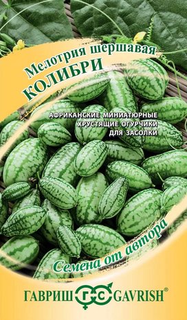 Колибри - новый сорт, рекомендуется для выращивания на приусадебных участках. Мелотрия - малораспространенная овощная культура семейства тыквенных, родом из Африки. Это своеобразный миниатюрный огурец - небольшие плодики (1,5-2,5 см) светло-зеленого цвета по вкусу напоминают огурец, а плотная кожица имеет приятный кисловатый привкус. Прекрасно подходит для засолки, маринования, по вкусу напоминает пикули. Мелотрия - однолетнее травянистое растение, которое формирует побеги длиной до 3 м. Листья треугольной формы, остороконечные, опушенные. Растения имеют ярко-желтые воронковидные раздельнополые цветки: женские расположены на растениях одиночно, мужские собраны в узлах по нескольку штук. Мелотрию используют в озеленении, растения хорошо ветвятся, быстро разрастаются, легко крепятся усиками к всевозможным опорам, полностью оплетая их. Очень неприхотлива, любит рыхлые, хорошо увлажненные почвы. Уход заключается в своеременных прополках, поливах, рыхлениях, 2 раза за сезон необходимо подкормить комплексными удобр