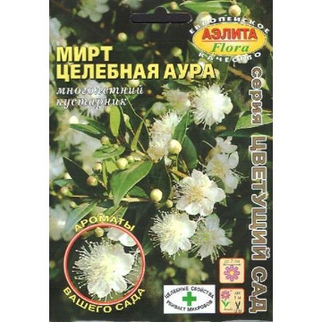 Удивительное многолетнее растение для дома, очищает и дезинфицирует воздух. Относительно устойчив к заморозкам, но не переносит засуху. Растение представляет собой куст, высотой около 1м. Цветет мирт белыми или розовыми ароматными цветками. После их увядания на растении появляются мелкие ягоды, которые по мере созревания окрашиваются в темно-синий цвет. При помощи обрезки кроне можно придать практически любую форму. Листья мирта блестящие, темно-зеленые, содержат большое количество эфирных масел.