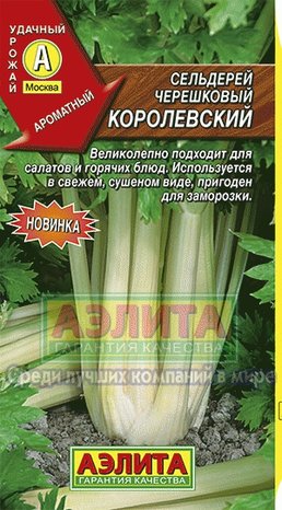 Великолепный среднеспелый сорт для использования в домашней кулинарии. Формирует мощную розетку листьев с крупными, мясистыми черешками салатово-золотистого цвета. Период от всходов до уборки 140-160 дней. Масса одного растения 700-800 г. Сельдерей черешковый очень богат витаминами и микроэлементами, имеет отличные вкусовые качества и высокую ароматичность. Используется в свежем виде для приготовления салатов, супов, приправ, подходит для заморозки и сушки. Свежие черешки хранятся достаточно долго после уборки. Для улучшения вкуса и отбеливания черешков, растения во второй половине лета окучивают грунтом.