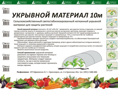 Обеспечивает оптимальный микроклимат для роста растений; предотвращает переохлаждение растений ночью и перегрев днем; уменьшает испарения с поверхности почвы, сохраняет почвенную влагу и снижает норму полива; создает баланс ночной и дневной температуры; позволяет продлить сбор урожая до поздней осени; является надежной защитой от вредителей и болезней; имеет срок службы не менее 3-х сезонов. Укрывной материал для крепления на каркас парника, крепление осуществляется способами аналогичными креплению обычной парниковой пленки.