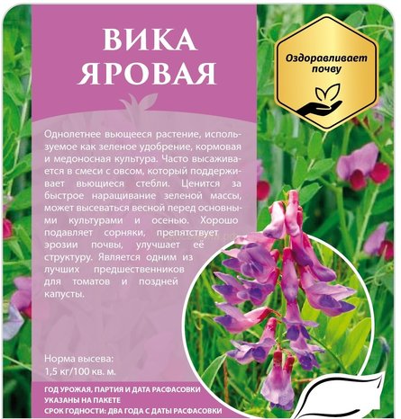 Однолетнее вьющееся растение, используется как зеленое удобрение, кормовая и медоносная культура. Часто высаживается в смеси с овсом, который поддерживает ее вьющи-еся стебли. Вика ценится за быстрое наращива-ние зеленой массы, может высеваться весной перед основными культурами или осенью. Этот сидерат хорошо подавляет сорняки, препятству-ет эрозии почвы, улучшает ее структуру, а также оказывает удивительно оздоравливающее действие на почву. Предпочитает нейтральные почвы. Скашивают вику до начала цветения. Посадку рассады производят через 14 дней после скашивания. Является одним из лучших предшественников для томатов и поздней капусты. Норма расхода семян 1,5 кг на 100м2