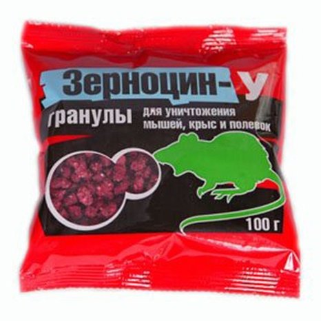 "ЗЕРНОЦИН-У" предназначен для борьбы с домовыми мышами, черными и серыми крысами, серыми и рыжими полевками. Средство применяют внутри и вокруг жилых домов, промышленных и сельскохозяйственных строений и других построек, включая жилые помещения и пищевые, детские и лечебные объекты. Средство "ЗЕРНОЦИН-У" представляет собой готовую к применению универсальную зерновую приманку розового цвета, содержит трифенацин (смесь производных индан-1,3-дионов, антикоагулянтов 1-го поколения) 0,015%. Трифенацин оказывает на кровь противосвертывающее действие, вызывает повреждения стенок кровеносных сосудов, в результате чего развивается кровоточивость, приводящая к гибели животных.